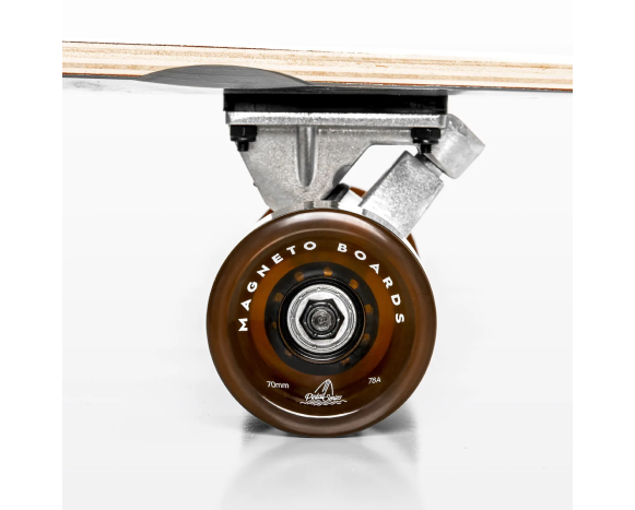 The decks are made with a dark stained maple veneer with clean graphics and crisp lines. The wheels are big and soft which smooths out the ride under your feet. Instead of covering the deck with boring black grip tape, we used a clear sand grit finish to show off the top of the deck while still providing good traction.